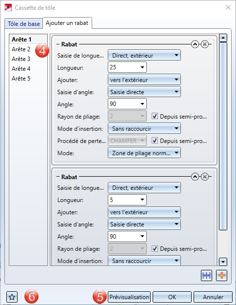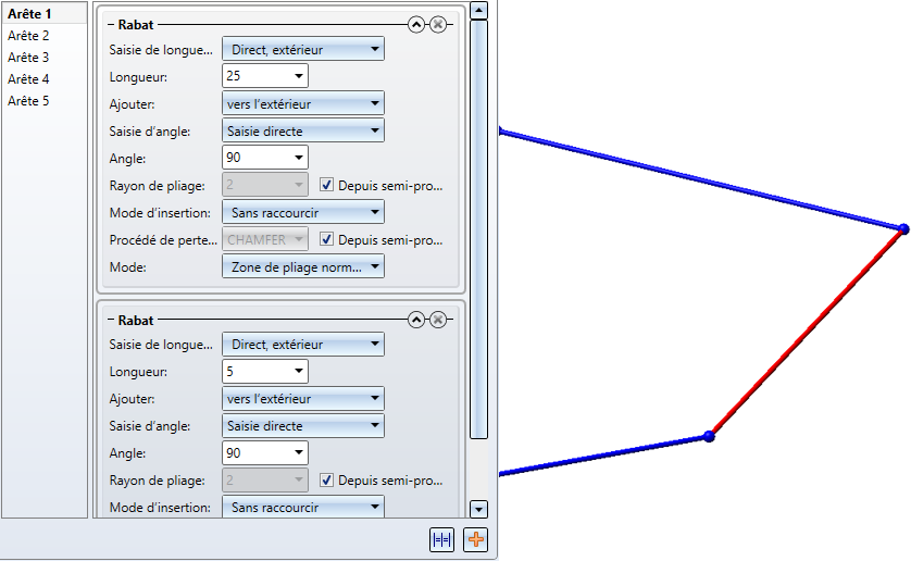 pour affecter à l'arête un ou plusieurs rabats. - Saisissez les paramètres du rabat.