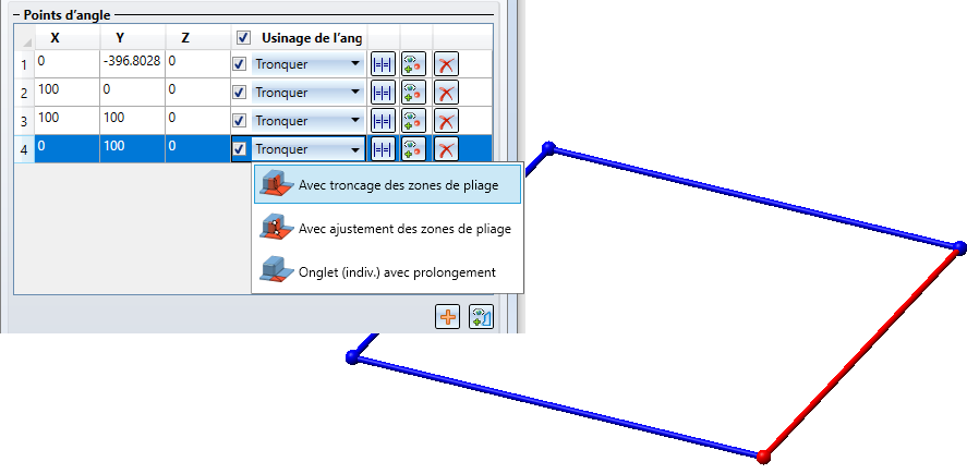 Vous avez la possibilité de modifier la forme de votre tôle de base dans l'encart Points d'angle en ajoutant d'autres points