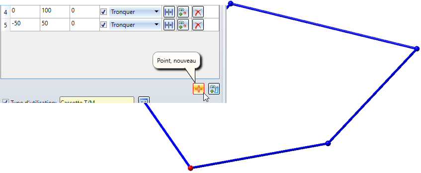 Cliquez sur cette icône pour insérer un nouveau point d'angle. Vous pouvez alors saisir les coordonnées par ses valeurs X,Y, Z ou déterminer un point sur la scène avec l'icône |