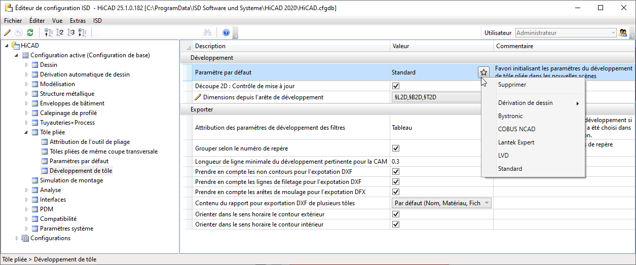 Le paramètre de la fenêtre de dialogue Paramètre par défaut de l'entrée Développé de tôle peut être enregistré comme Favoris