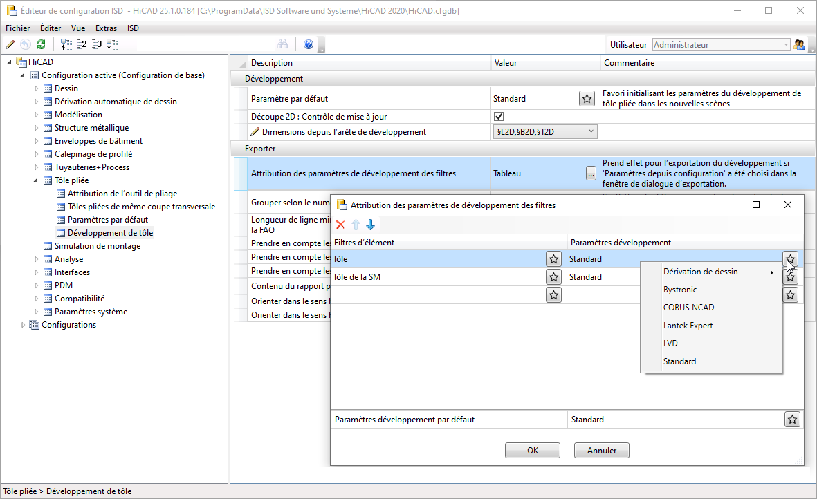 et ainsi réutilisés à tout moment. Pour l'exportation des Projections développées comme DXF, vous pouvez utiliser ces Favoris (par ex. pour LVD, Bystronic ou COBUS). L'attribution des favoris aux filtres d'élément (Tôle ou Tôle de la Structure métallique) se fait par le Gestionnaire de Configuration sous Tôle pliée > Développé de tôle > Attribution des paramètres de développé des filtres. Les filtres d'élément sont des filtres prédéfinis par ISD aussi bien que des filtres manuels de la Recherche d'élément qui ont été enregistrés comme favoris.