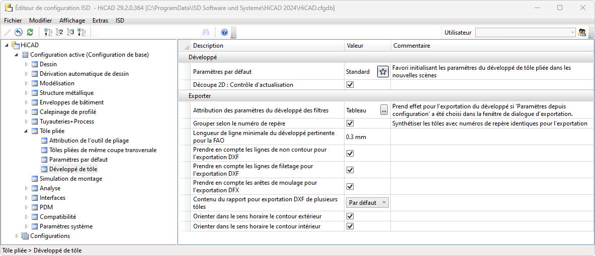L'orientation des polylignes fermées est ajustable pour l'exportation des projections développée de tôle. Dans le Gestionnaire de Configuration, vous pouvez choisir pour le contour intérieur et extérieur sous Tôle pliée > Développé de tôle le sens horaire ou non.