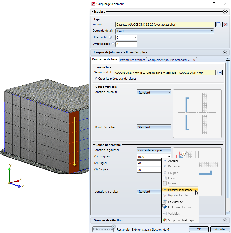 Sélectionnez ici également ALUCOBOND SZ20 et appliquez par OK les paramètres standards. Un 2e ensemble est créé avec le nom Calepinage d'élément.