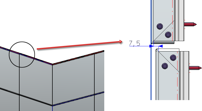 Ce décalage survient en raison du fait que pour les deux calepinages de cassettes + panneaux un espace standard de 7.5 a été utilisé et que les esquisses se rejoignent à l'arête angulaire.