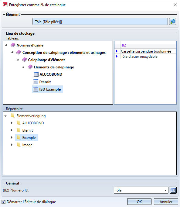 Sous Général, vous pouvez modifier la désignation (BZ) de la variante dans le catalogue. Par défaut, il s'agira du Numéro ID de l'élément/ensemble sélectionné. Par un clic sur le symbole