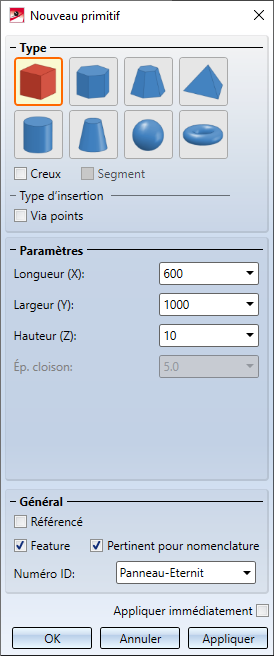 - Créez dans cet ensemble un parallélépipède au moyen de Standard 3D > Primitif. Indiquez pour ces dimensions les valeurs suivantes dans les champs de saisie :