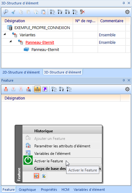 - Sélectionnez l'ensemble Panneau-Eternit. Celui-ci ne possède encore aucun historique de Feature, c'est pourquoi il vous faut l'activer : cliquez ici avec le bouton droit de la souris dans la zone vide de la fenêtre de l'onglet Feature dans l'ICN et sélectionnez la fonction Activer le Feature.