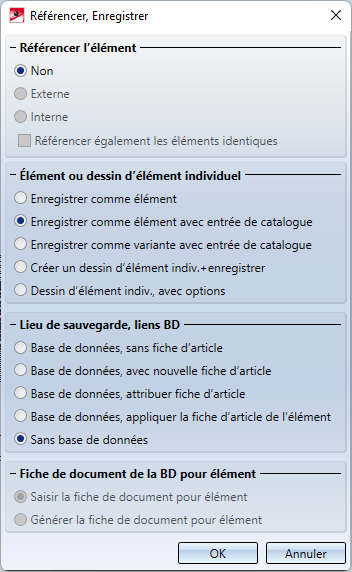 - Le parallélépipède est maintenant prêt pour être enregistré dans le catalogue pour un futur calepinage d'élément. Sélectionnez l'ensemble Panneau-Eternit et activez la fonction Scène > Enreg./Référencer > Élément (Référencer l'élément, Enregistrer, Dessin d'élément individuel). Dans la fenêtre qui apparaît, cochez Sans référencer, Enregistrer comme élément avec entrée de catalogue et Sans base de données.