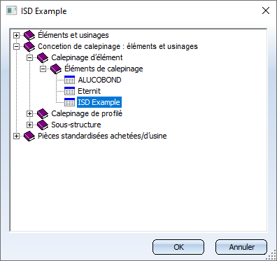 - Comme répertoire de données, sélectionnez Werksnormen\Elementverlegung\Example, comme catalogue Conception de calepinage : éléments et usinages \Calepinage d'élément\Éléments de calepinage\ISD Example. Vous pouvez reprendre les données qui apparaissent telles quelles ; un bitmap ne doit pas être créé.