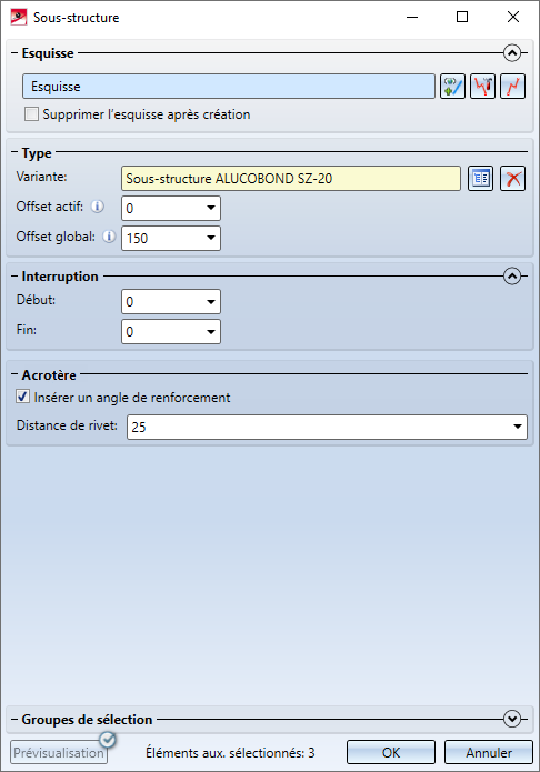 La fonction Calepinage de cassettes+panneaux > Sous-structure dans la fenêtre d'ancrage des Fonctions Bâtiment est lancée pour créer une sous-structure sur la base de l'esquisse. Le type de sous-structure choisi ici est la Sous-structure ALUCOBOND SZ20. L'Offset global est réglé sur 150 afin que la sous-structure soit créée à une distance appropriée du mur pour nos supports muraux.