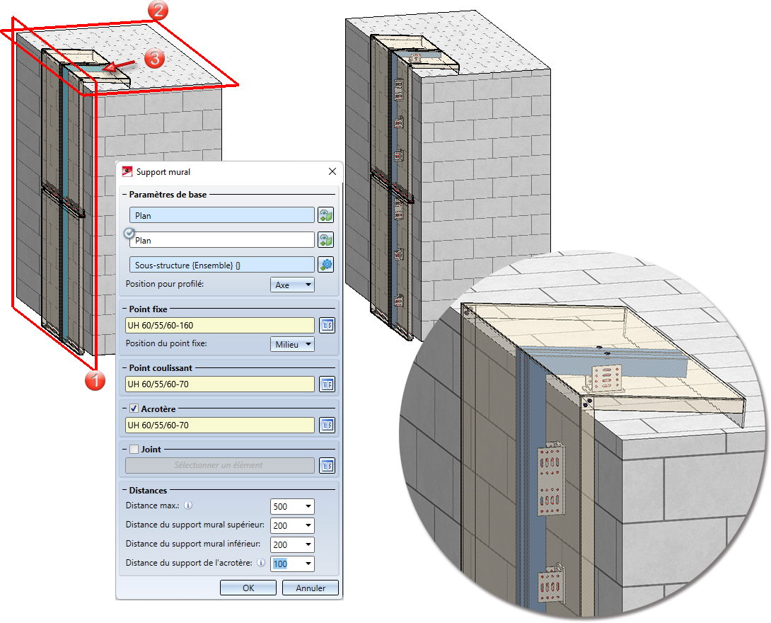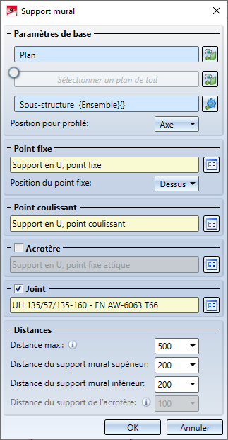 Lorsque la sous-structure comporte des joints, vous pouvez alors les munir de supports muraux. Cochez pour cela la case Joint, sélectionnez un support mural depuis le catalogue. Ces supports muraux seront placés au centre des joints et pris en compte dans les calculs des distances. Si cette case n'est pas cochée, chaque profilé de la sous-structure est considéré séparément et pourvu de supports muraux.