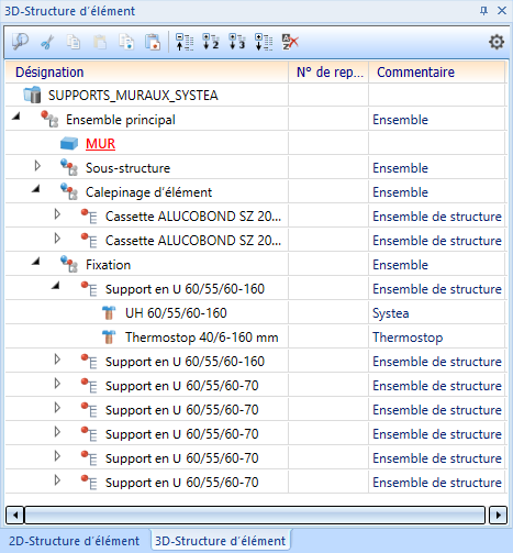Les supports muraux sont insérés sur la scène comme des Ensembles de structure et regroupés dans un Ensemble sous le nom de Fixation.