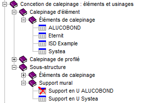 Vous pouvez sauvegarder l'élément terminé dans le catalogue : lancez la fonction Scène > Enregistrer/Référencer > Enregistrer l'élément référencé, Dessin individuel. Sélectionnez seulement Enregistrer comme élément avec entrée de catalogue, puis enregistrez l'élément dans le catalogue, sous Conception de calepinage : éléments et usinages\Sous-structure\Support mural.