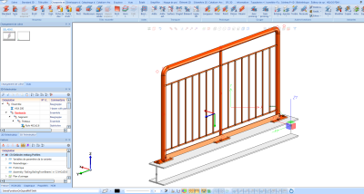 Dans cet exemple, nous utiliserons une rambarde créée et posée le long d'un profilé grâce au configurateur de rambardes (dans la fenêtre Fonctions Bâtiment, accédez à Structure métallique > Escaliers+Rambardes > Rambardes > Configurateur de rambarde (le long des profilés)) :