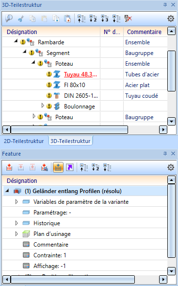 En exécutant cette fois-ci une deuxième fois la fonction Résoudre la variante sur l'entrée de Feature de l'élément correspondant (ici l'élément Rambarde le long des profilés (résolu)), il devient possible « de révéler » les Features à partir desquels cette variante de rambarde a été créée. Après la résolution, l'entrée du Tube en acier devrait ressembler à ceci :
