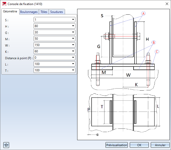 À titre d'exemple pour les trois variantes, la fenêtre de dialogue pour la configuration d'une Console de fixation (1410) ouverte sur l'onglet Géométrie.