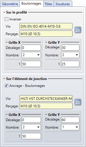 Dans l'onglet Boulonnages, vous pouvez procéder à la saisie exacte des données pour chacun des boulonnages, Sur le profilé et Sur l'élément de jonction.