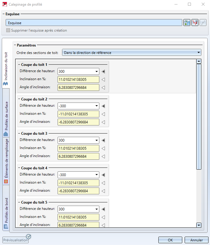 L'onglet Inclinaison du toit vous permet de concevoir des toits inclinés à l'intérieur d'un calepinage de profilé.