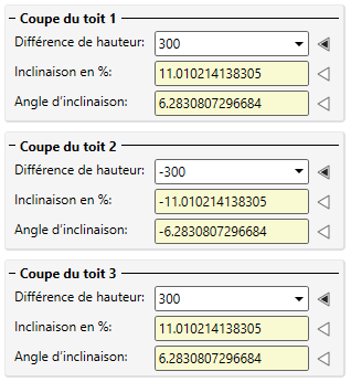 L'arête de la Coupe du toit 1 pointant vers l'extérieur reste ancrée au même niveau que l'esquisse, et l'inclinaison de la surface du toit se réfère à celle du côté opposé. La surface adjacente suivante se réfère ensuite à l'inclinaison de ce côté, et ainsi de suite.