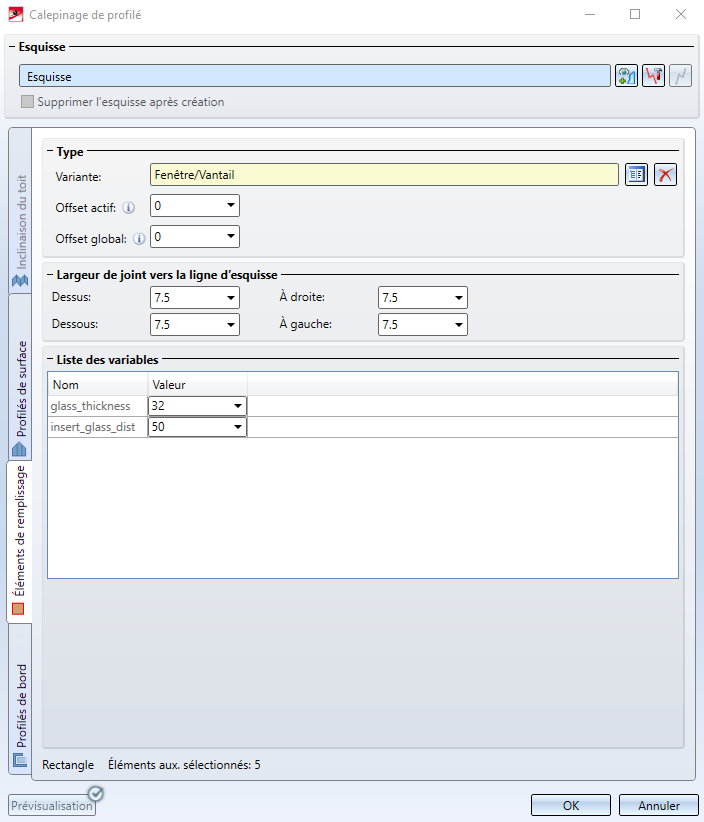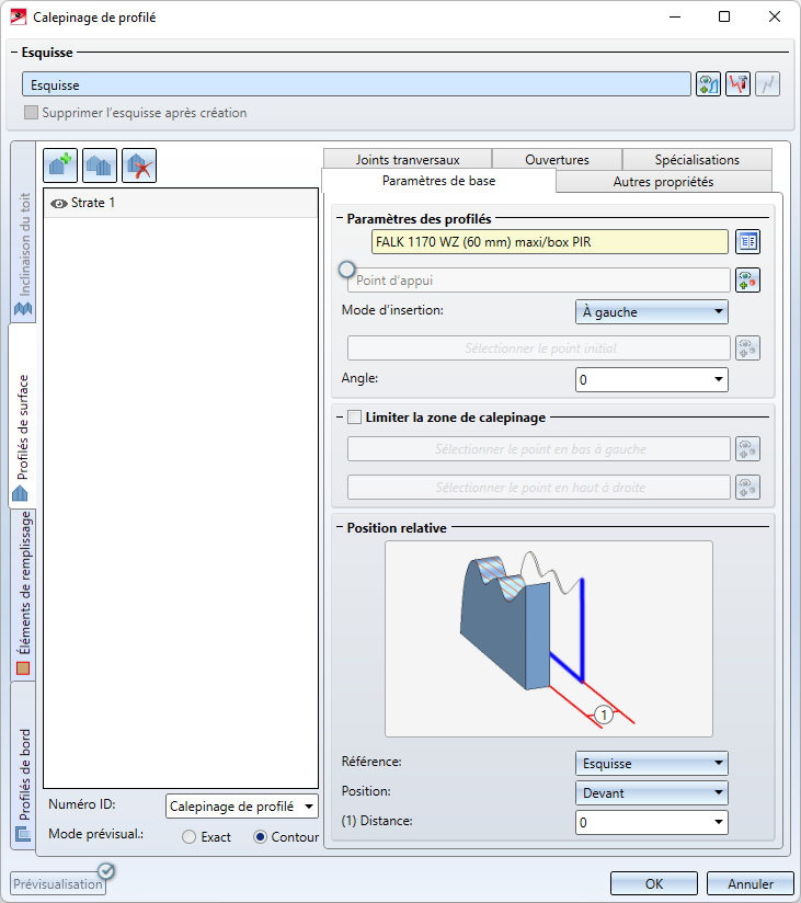 L'onglet Profilé de bord permet d'apposer des profilés (un débord de toit p. ex.) le long des bordures de l'esquisse.