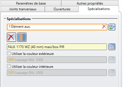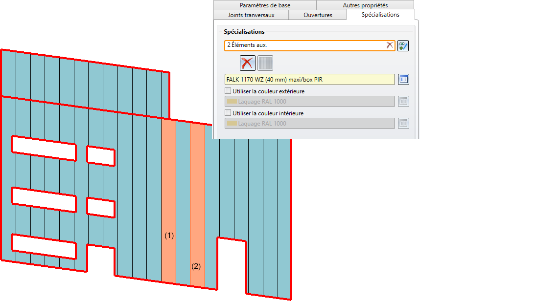 Avec les options de cet onglet, vous avez la possibilité d'attribuer un type de profilé qui diffère des paramètres de base de la surface de calepinage à un ou plusieurs panneaux de profilés. En outre, il est possible d'en sélectionner la couleur extérieure et intérieure. Celle-ci est sélectionnée dans le catalogue Nomes d'usine > Traitement de surface.
