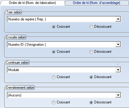 L’affichage de la nomenclature de fabrication et d'assemblage peut être modifié selon différents critères. Jusqu’à 4 critères de tri différents peuvent être appliqués.