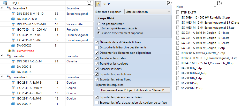 (1) Arborescence HiCAD, (2) Paramètres d'exportation, (3) Fichiers STP générés