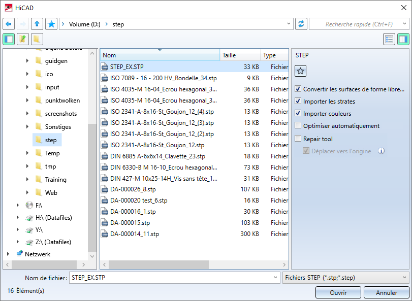 Après avoir lancé la fonction, sélectionnez d'abord en bas à droite le type de fichier STEP (*.stp, *.step), puis le fichier STEP que vous souhaitez ouvrir.