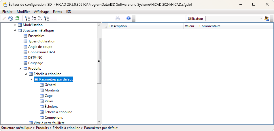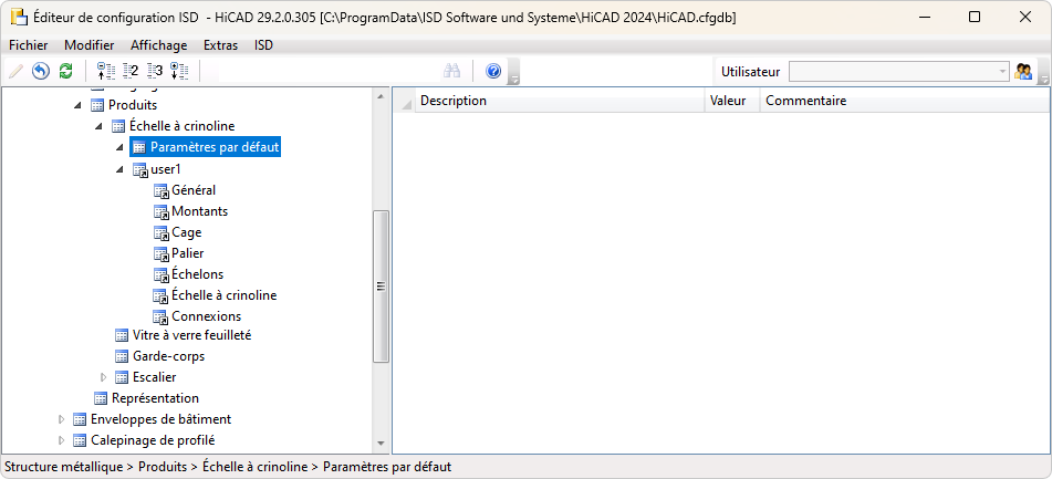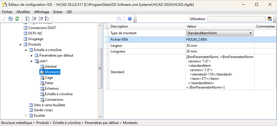 Les configurations d'échelles à crinoline individuelles et personnalisées peuvent être également créées et gérées à l'aide de l'Éditeur de configuration de HiCAD. Vous lancez l'éditeur de configuration en exécutant le fichier ISDConfigEditor.exe situé dans le répertoire EXEde HiCAD.