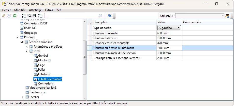 - En cliquant sur chacun des sous-dossiers, vous pouvez désormais modifier les paramètres de la configuration. Si vous souhaitez par exemple modifier la hauteur de bâtiment, allez dans la section Échelle à crinoline, puis entrez la valeur souhaitée dans le champ Hauteur bâtiment.