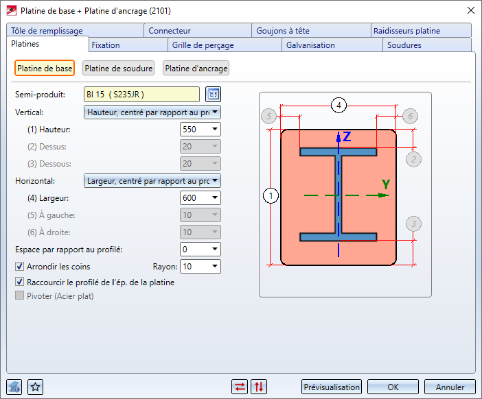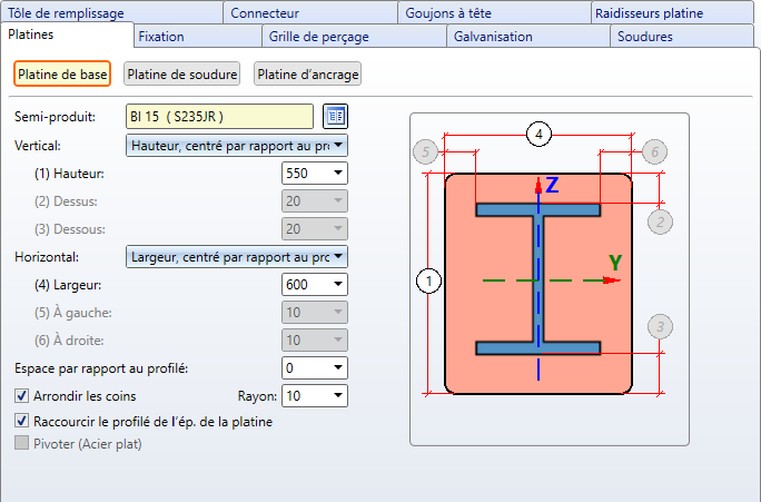 Dans cet encart, vous déterminez le type et la taille de la platine de base, de soudure et d'ancrage, ainsi que leur orientation par rapport au profilé sélectionné.