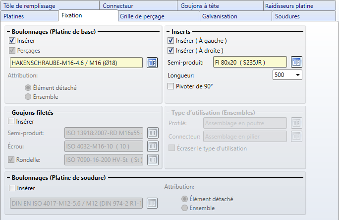 Si la fixation doit être effectuée par un boulonnage inséré par en dessous dans la platine d'ancrage, cochez alors la case Insérer. Les platines de base, de soudure et d'ancrage seront alors vissées ensemble.