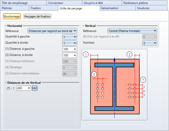 Déterminez en cochant les cases correspondantes quels trous doivent être créés et saisissez le diamètre des trous ainsi que la distance minimale par rapport à l'aile et à l'âme.