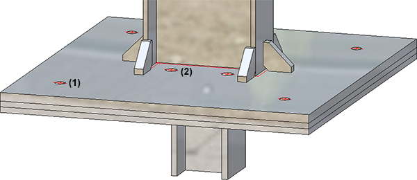 À l'aide de cette fonction, vous insérez des platines de base et des platines d'ancrage pour un pilier. L'insertion peut être faite avec des platines soudées et d'ancrage, connecteur y compris, et avec platine frontale si nécessaire, et avec goujons ou ancre avec inserts. Également l'insertion de raidisseurs supplémentaires sur l'aile et l'âme, l'insertion de soudures ainsi que des perçages pour la galvanisation sont possibles.
