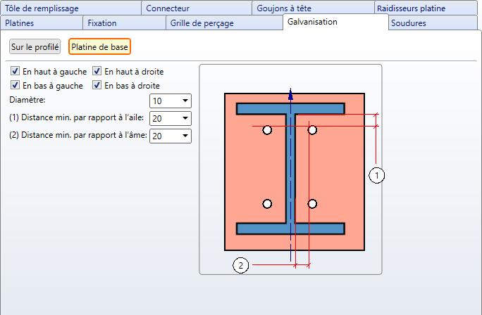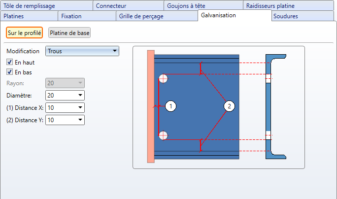 Spécifiez ici si la platine de base et le profilé de référence doivent être munis de trous pour la galvanisation. Activez pour cela l'encart correspondant en haut à gauche.