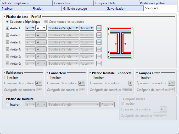 Dans cet onglet, vous spécifiez en cochant les cases correspondantes quelles soudures doivent être créées entre le profilé et la platine de base :