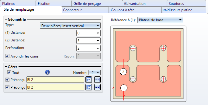 Saisissez selon le type de géométrie sélectionnée, la distance par rapport au bord de la platine ainsi que la distance entre les tôles de remplissage. La distance par rapport au bord de la platine peut se référer soit à la platine de base soit à la platine de soudure. Sélectionnez la platine de votre choix dans la liste de choix Référence à (1). La taille des tôles de remplissage sera déterminée par la distance et la référence.