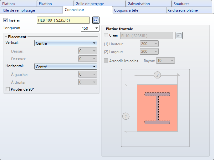 Si le connecteur doit être muni d'une platine frontale, cochez alors sous Platine frontale la case Créer. La platine frontale peut optionnellement être arrondie.