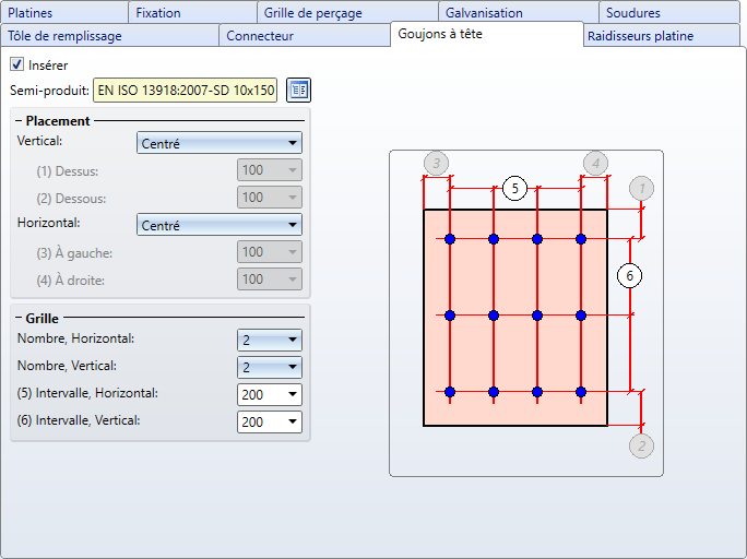 Vous spécifiez dans cet onglet si des goujons à tête doivent être insérés. Si oui, cochez alors la case Insérer et sélectionnez les goujons de votre choix.