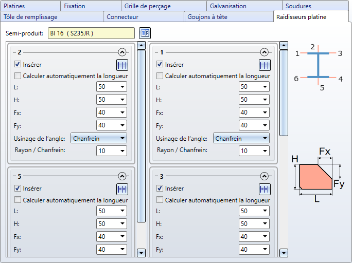 Pour chaque raidisseurs possible (2 et 5 sur l'âme, 1, 3, 4 et 6 sur l'aile) les paramétrages suivants sont disponibles :