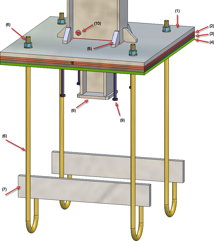 (1) Platine de base, (2) Tôles de remplissage, (3) Platine de soudure, (4) Platine d'ancrage, (5) Raidisseurs, (6) Boulonnages (platine de base), (7) Insert, (8) Connecteur avec platine frontale, (9) Goujons à tête, (10) Trous pour la galvanisation