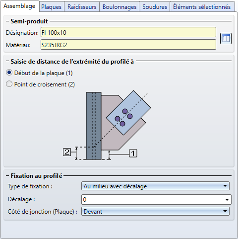 Décalage / Coté de jonction (Profilé) Si vous avez sélectionné comme type de fixation Au milieu avec décalage, indiquez alors ici la valeur pour le décalage souhaité. Pour les autres types de fixation, sélectionnez le côté de jonction (Aile de devant / de derrière). Coté de jonction (Plaque) Déterminez ici sur quel côté de la tôle le produit semi-fini sélectionné devra être raccordé : Devant ou Derrière. |