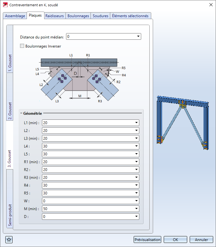Par un clic sur le bouton Prévisualisation, vous pouvez avoir un aperçu de le contreventement en K basé sur les données saisies actuelles. Si vous souhaitez corriger les données, procédez aux modifications nécessaires et cliquez à nouveau sur Prévisualisation pour actualiser l'aperçu. Par OK, l'assemblage est inséré à partir des données actuelles et la fenêtre de dialogue est fermée. Si vous quittez la fenêtre de dialogue par Annuler, la fonction est abandonnée sans insérer ou modifier l'assemblage.