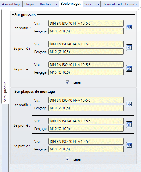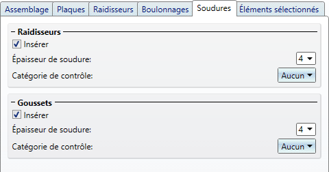 Vous déterminez ici si des soudures doivent être insérées sur les raidisseurs et les goussets. Pour insérer les soudures, cochez la case Insérer et indiquez l'épaisseur du cordon de soudure et la catégorie de contrôle.