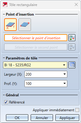 Si la case Appliquer immédiatement est cochée, la nouvelle tôle est immédiatement ajoutée si la saisie est pertinente et peut ensuite être modifiée ultérieurement à l'aide du Feature de la tôle, si ce dernier a été créé.