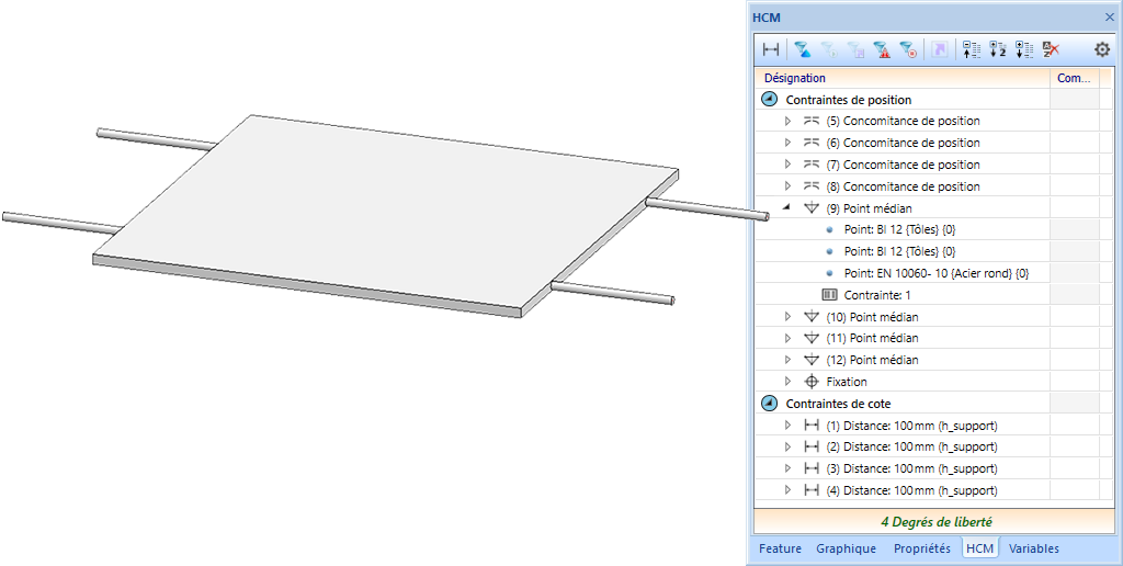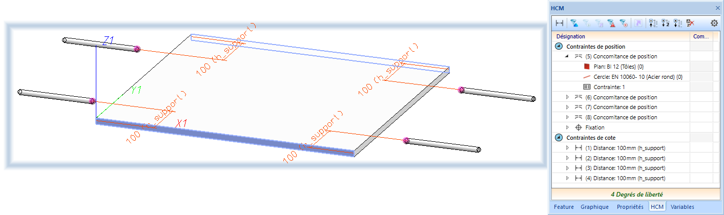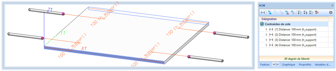 ), et ce toujours entre le point d'extrémité de l'axe et le côté supérieur ou inférieur de la tôle. Comme variable, nous choisissons ici h_support, avec une valeur de départ de 100 . Cette étape doit être répétée pour les quatre supports et l'ensemble doit être actif ! La modélisation HCM de l'ensemble contient enfin quatre contraintes de distance.