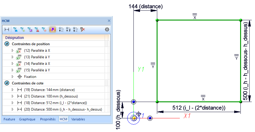 ). Ce point représente l'origine. Puis nous attribuons les variables à l'esquisse en définissant les contraintes de cote HCM correspondantes (Esquisse > HCM > Cotation intelligente